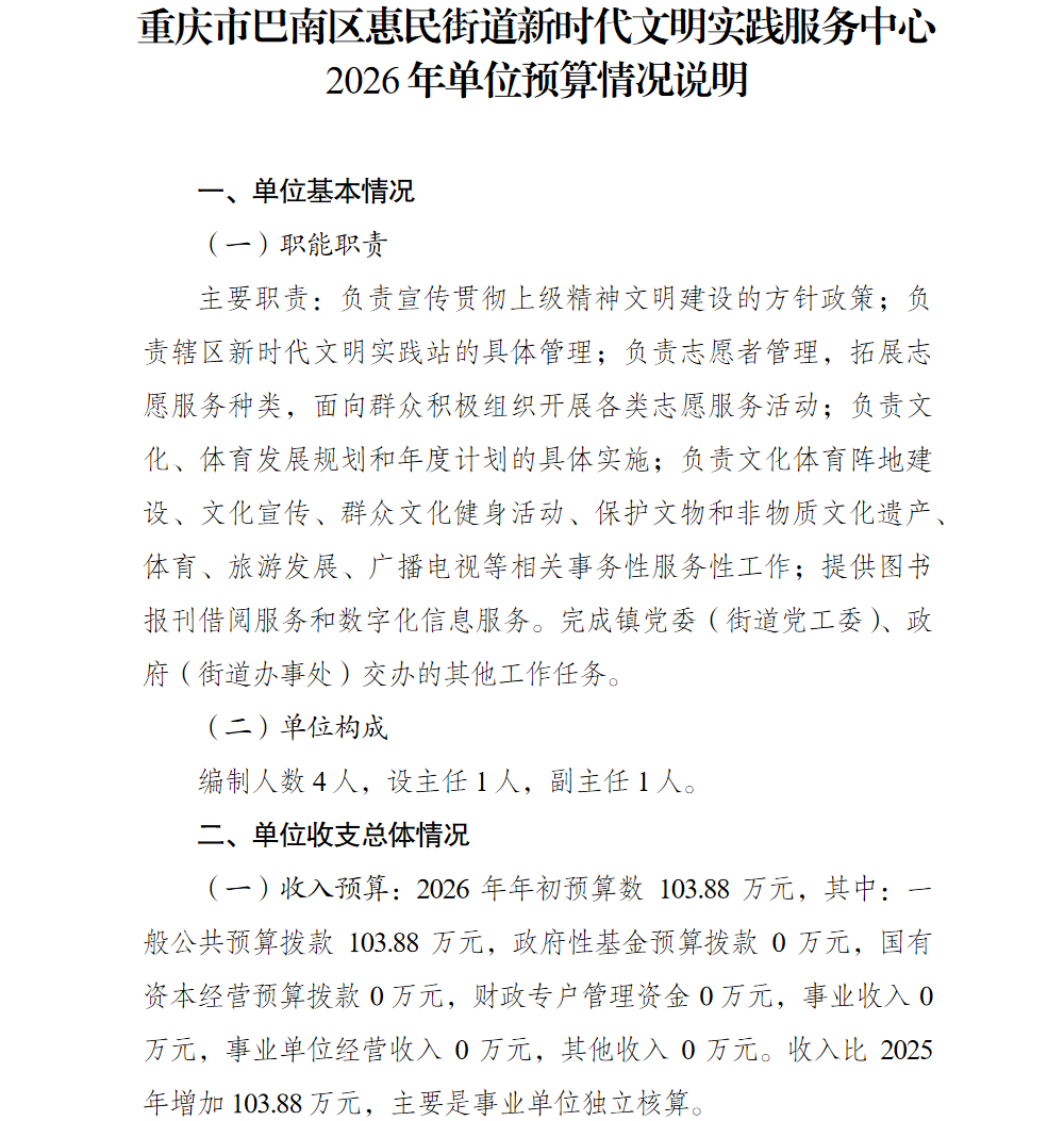 重庆市巴南区惠民街道新时代文明实践服务中心2026年单位预算情况说明