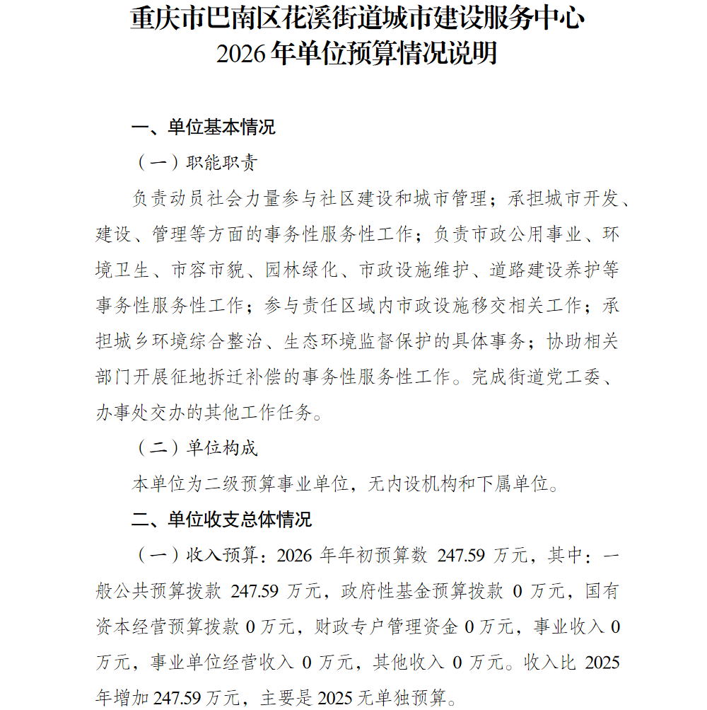 重庆市巴南区花溪街道城市建设服务中心2026年单位预算情况说明