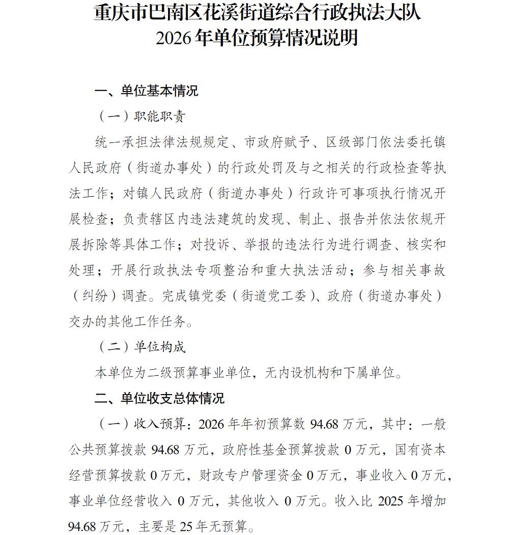 重庆市巴南区花溪街道综合行政执法大队2026年单位预算情况说明