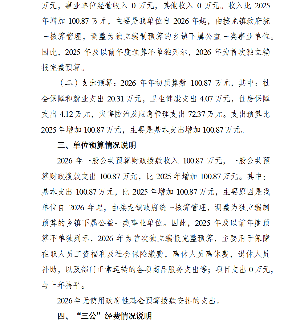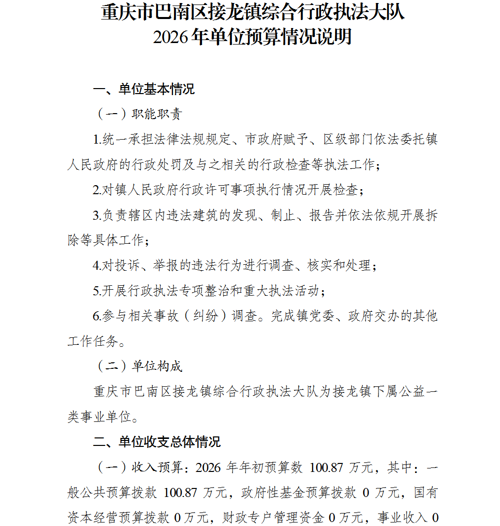 重庆市巴南区接龙镇综合行政执法大队2026年单位预算情况说明