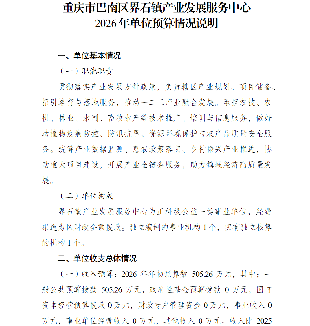 重庆市巴南区界石镇产业发展服务中心2026年单位预算情况说明