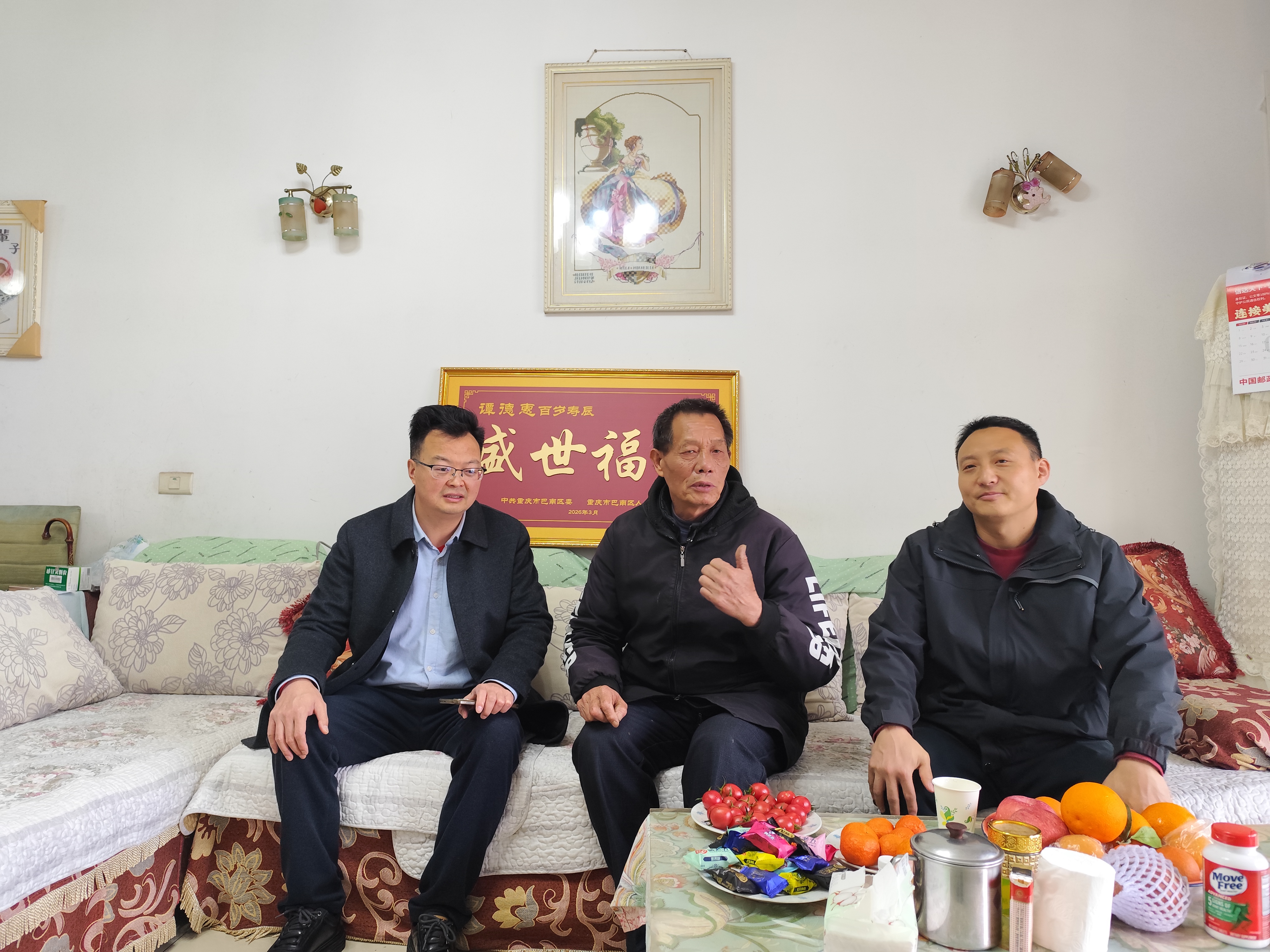 2026年3月24日,木洞镇副镇长刘光华带领民生服务岗工作人员前往钱家湾村慰问村内百岁老人,并现场向家属宣传讲解养老服务相关政策。