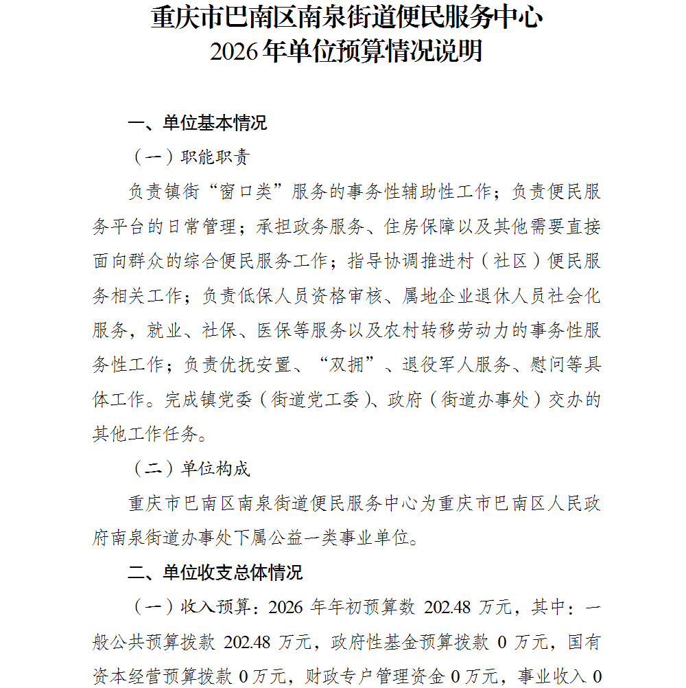 重庆市巴南区南泉街道便民服务中心2026年单位预算情况说明及附表