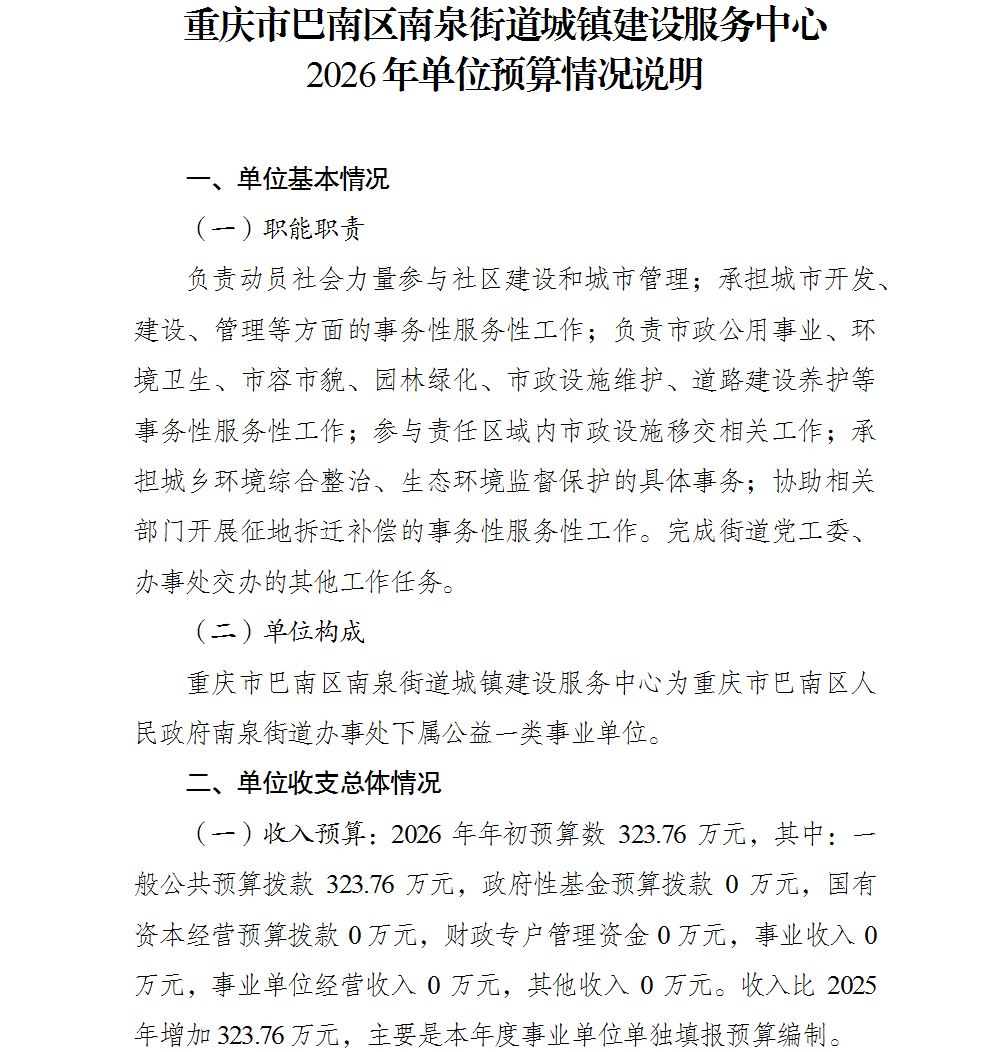 重庆市巴南区南泉街道城镇建设服务中心2026年单位预算情况说明及附表