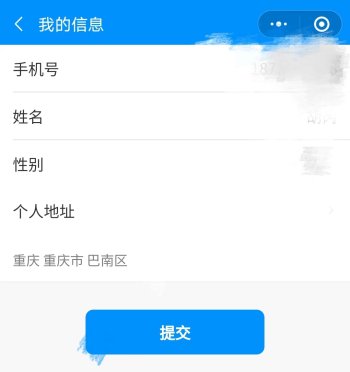 点击右上角“我的”,根据实际情况依次填写个人详细信息并提交。其中,个人地址一定要填写为“重庆市巴南区”。