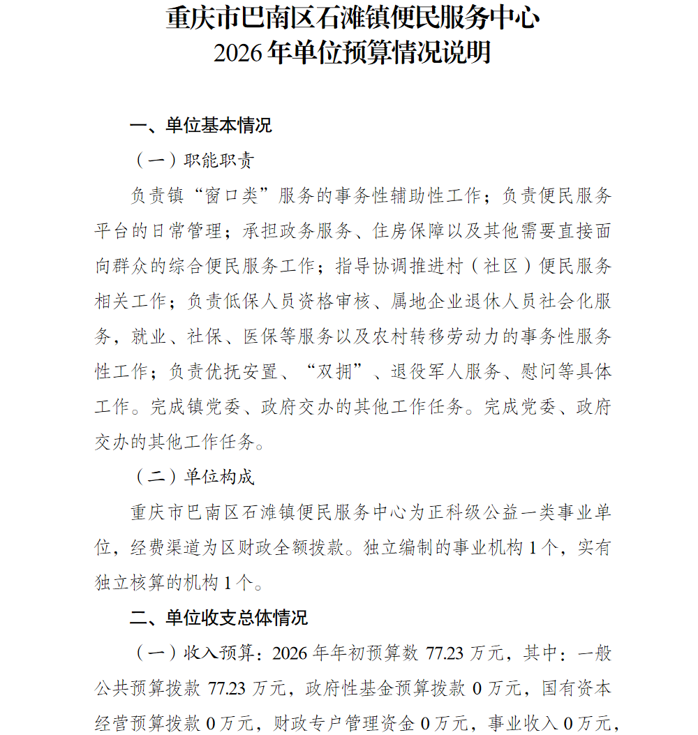重庆市巴南区石滩镇便民服务中心2026年部门预算情况说明