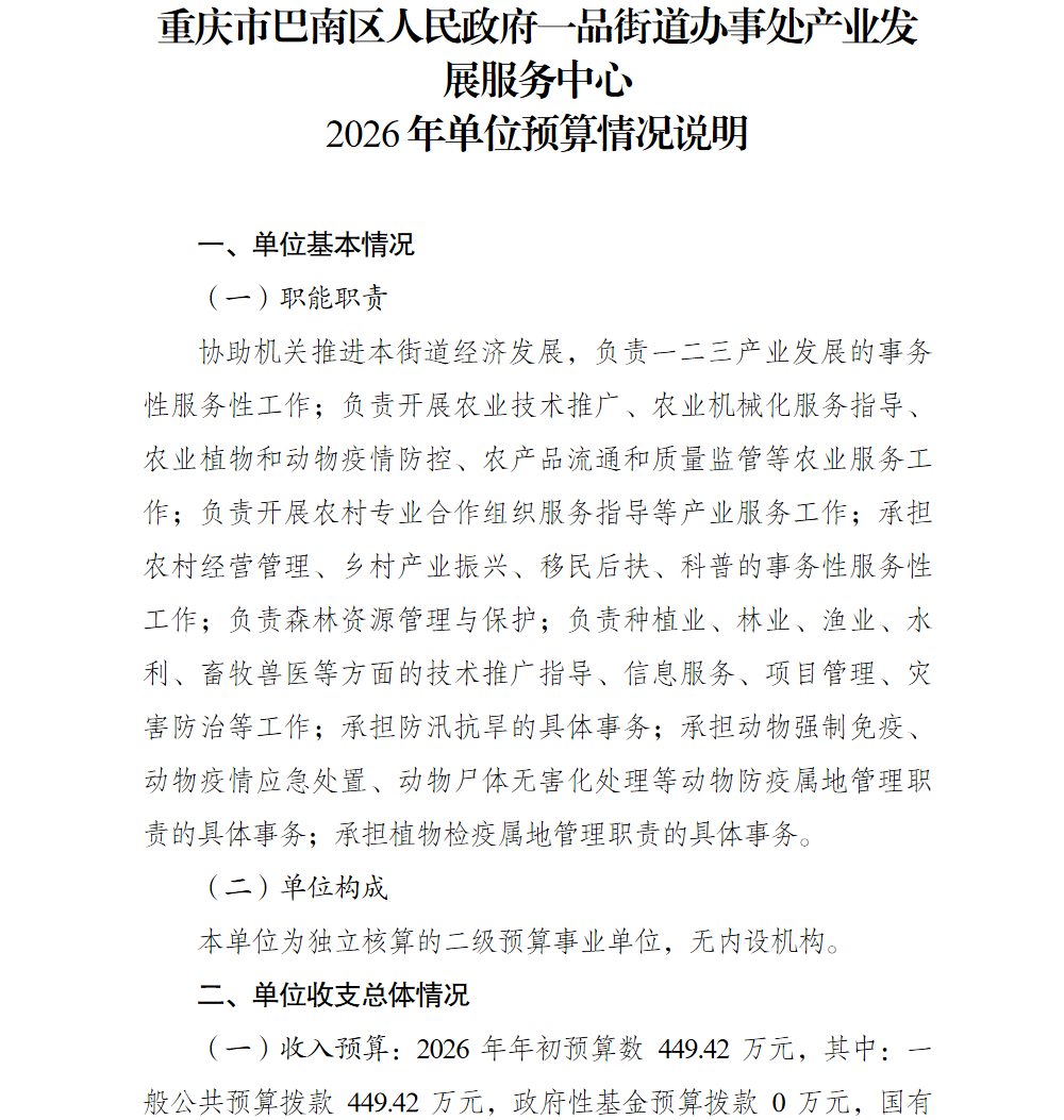 重庆市巴南区人民政府一品街道办事处产业发展服务中心2026年单位预算情况说明
