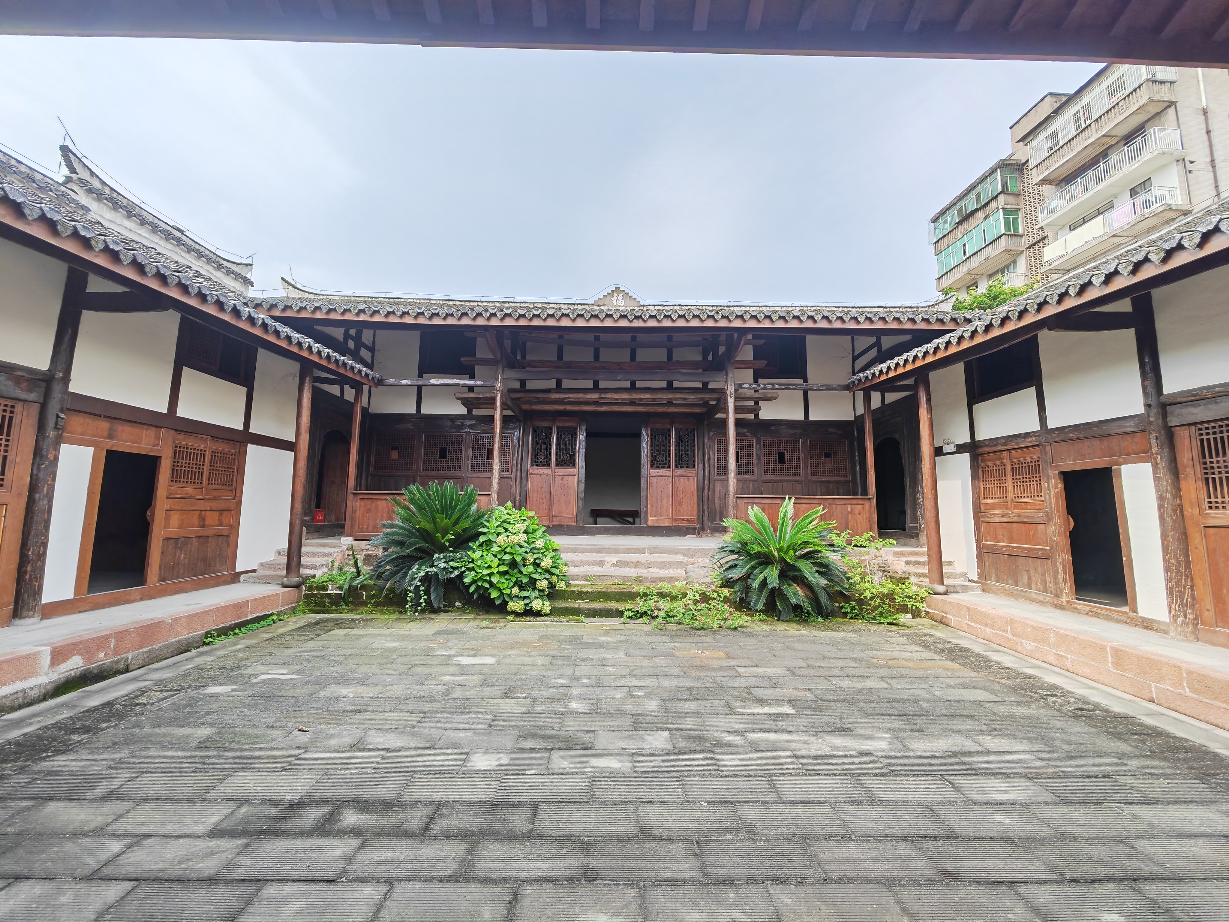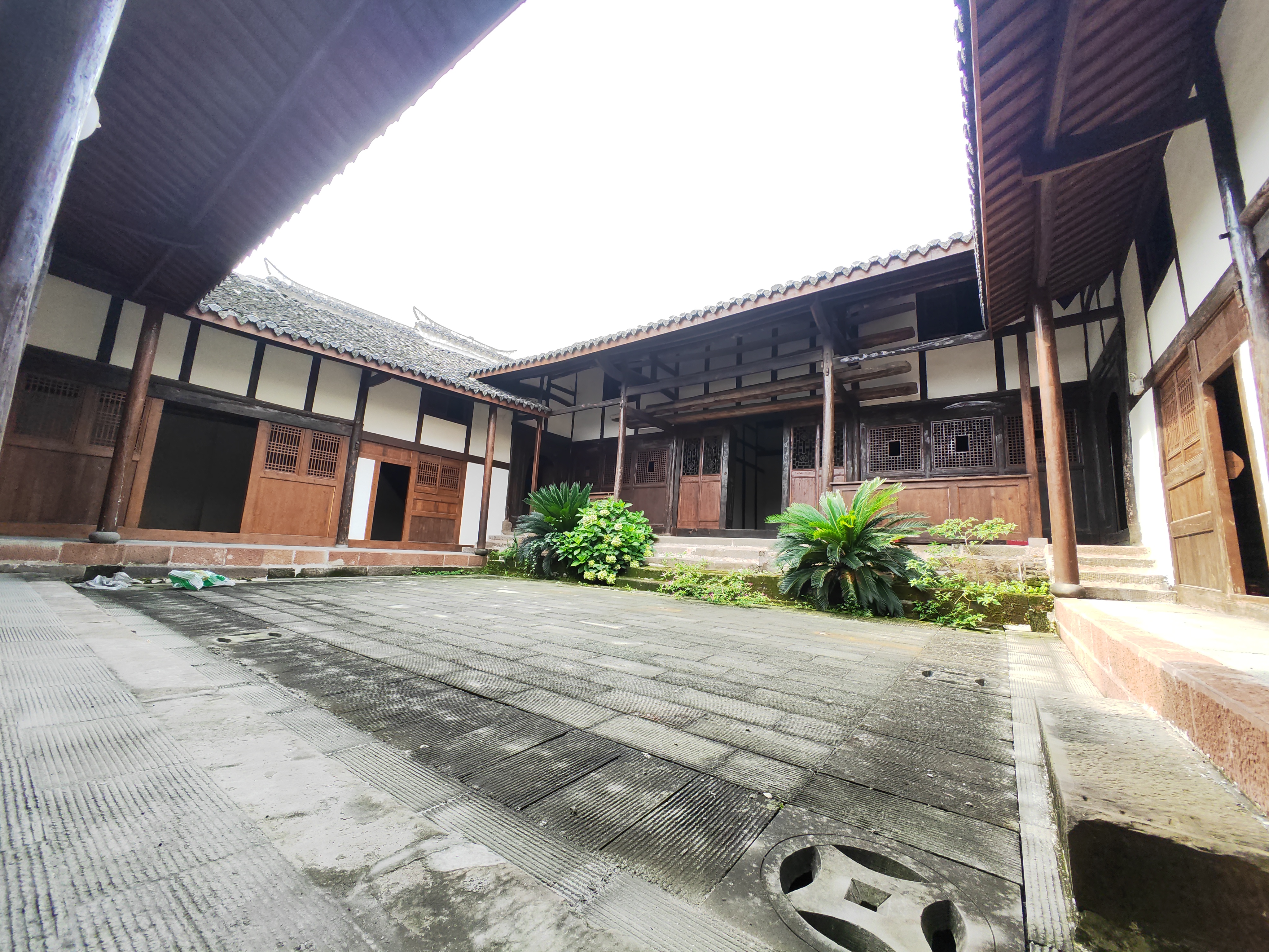 黄家大院乃黄启璪旧居,位于木洞镇,修建于清代末期。现状总用地面积739.84平方米,现状总建筑面积813.81平方米,坐东南向西北,四合院布局,由门楼、正厅和左右厢房以及沿街店铺组成。悬山式小青瓦屋顶,穿斗式木构架,外围有青砖灌斗墙体围护,内部是木板或竹编隔断,褐色黏土夯实地面,部分保留有隔潮地板,青砂石砌筑房基。房屋正门呈“八”字形,天井四周用条石镶嵌,正厅房顶脊饰有“寿”字形瓦雕。正厅及厢房立面保留有部分隔扇、雕花。该处建筑为研究清代末期建筑平面布局及木构架等方面提供了新材料。