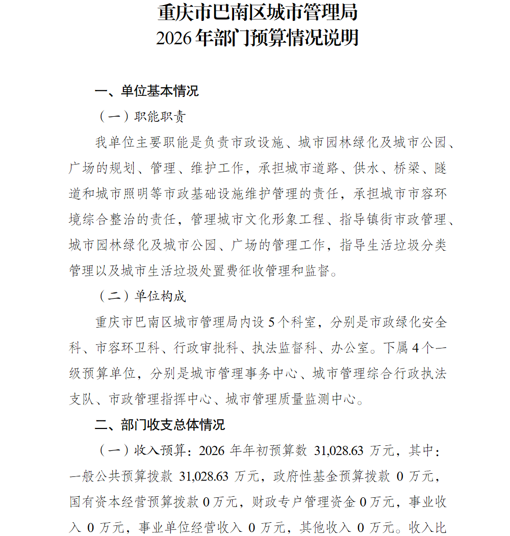 重庆市巴南区城市管理局2026年部门预算情况说明