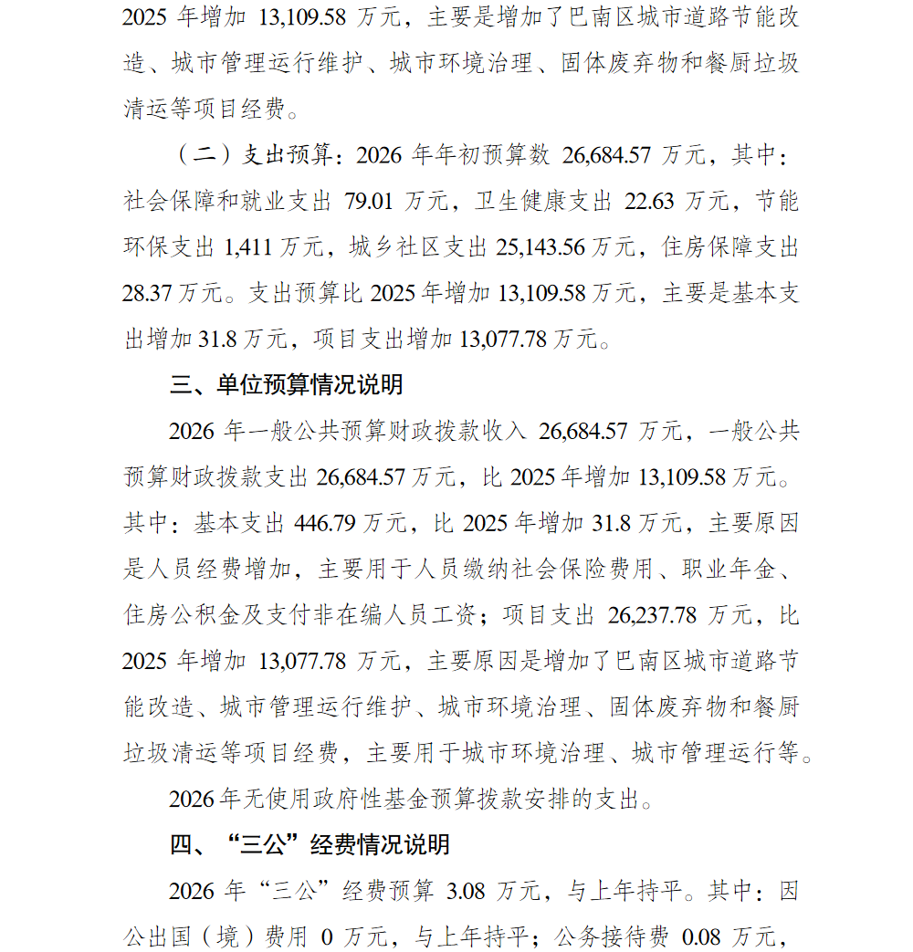 重庆市巴南区城市管理局(本级)2026年单位预算情况说明