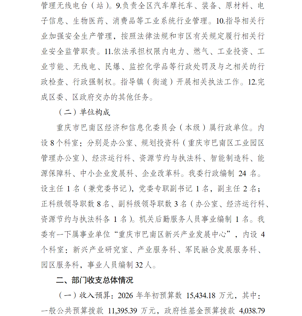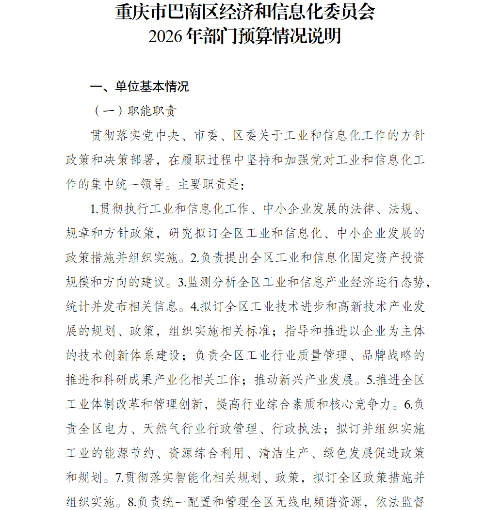 重庆市巴南区经济和信息化委员会2026年部门预算情况说明