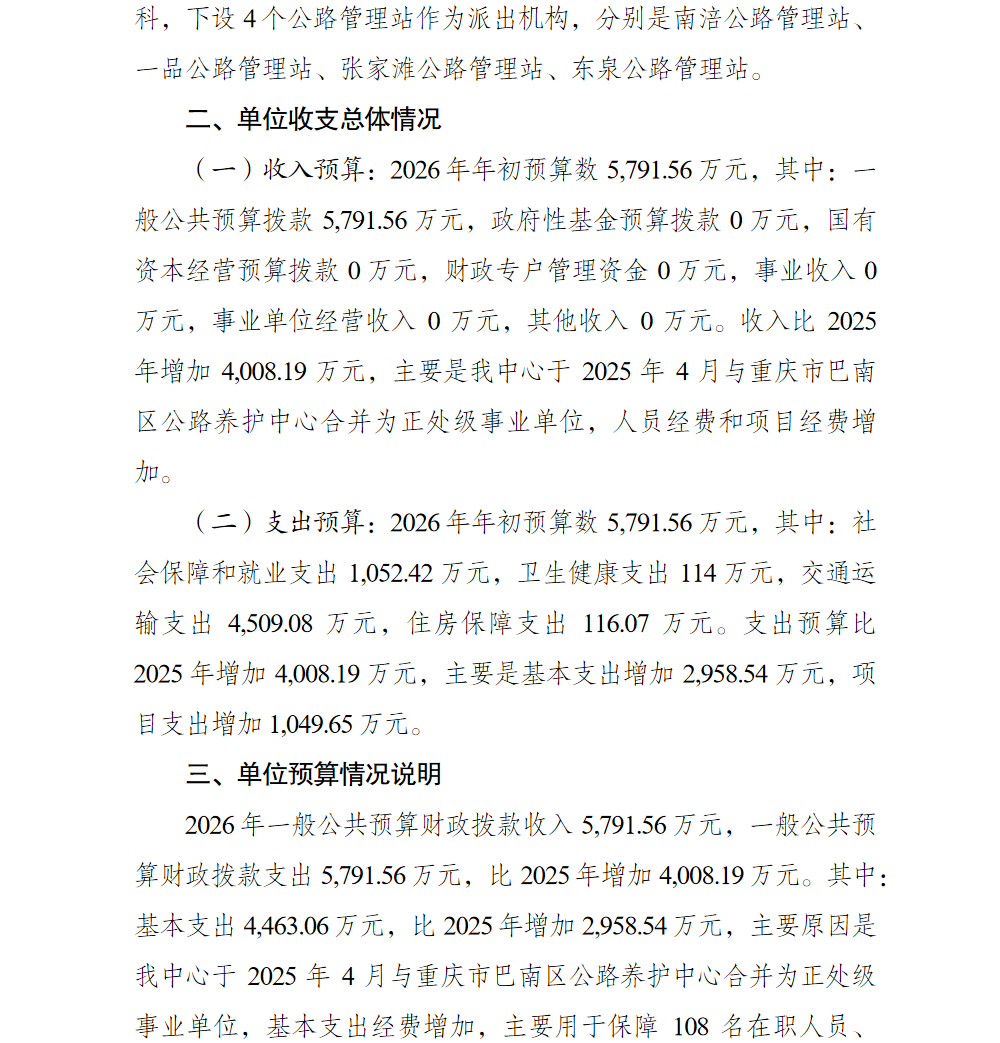 重庆市巴南区公路事务中心2026年单位预算情况说明