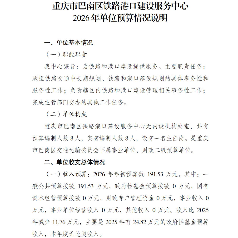 重庆市巴南区铁路港口建设服务中心2026年单位预算情况说明