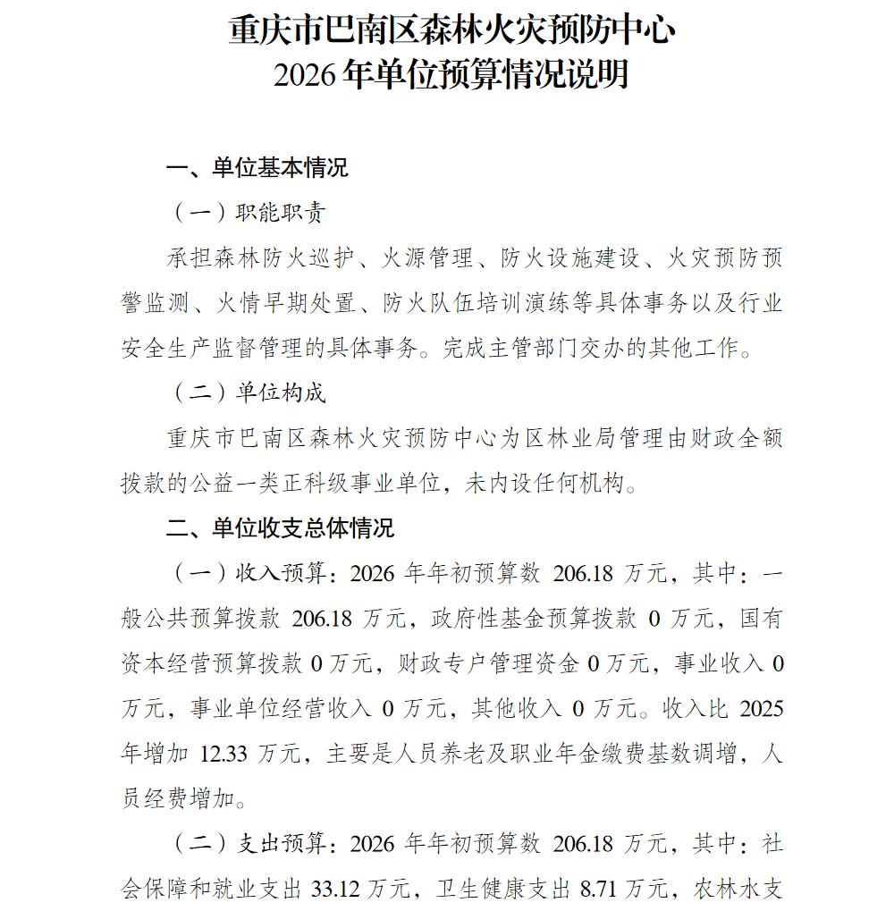 重庆市巴南区森林火灾预防中心2026年单位预算情况说明