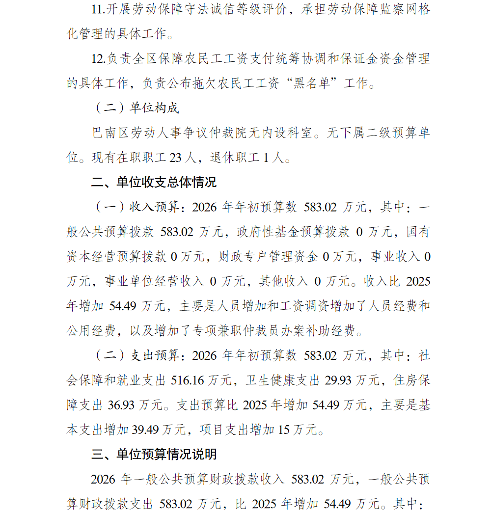 重庆市巴南区劳动人事争议仲裁院 2026 年单位预算情况说明