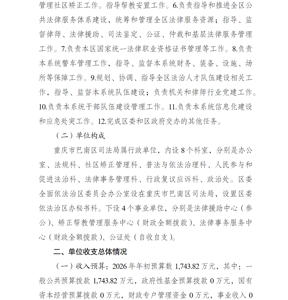 重庆市巴南区司法局(本级) 2026 年单位预算情况说明