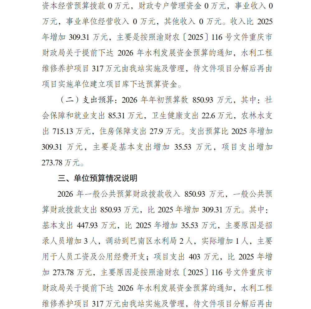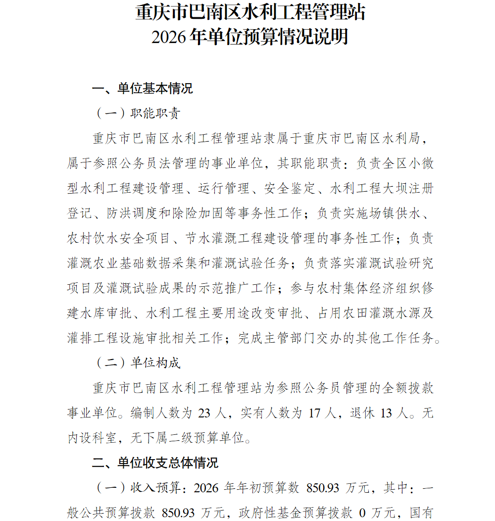 重庆市巴南区水利工程管理站2026年单位预算情况说明