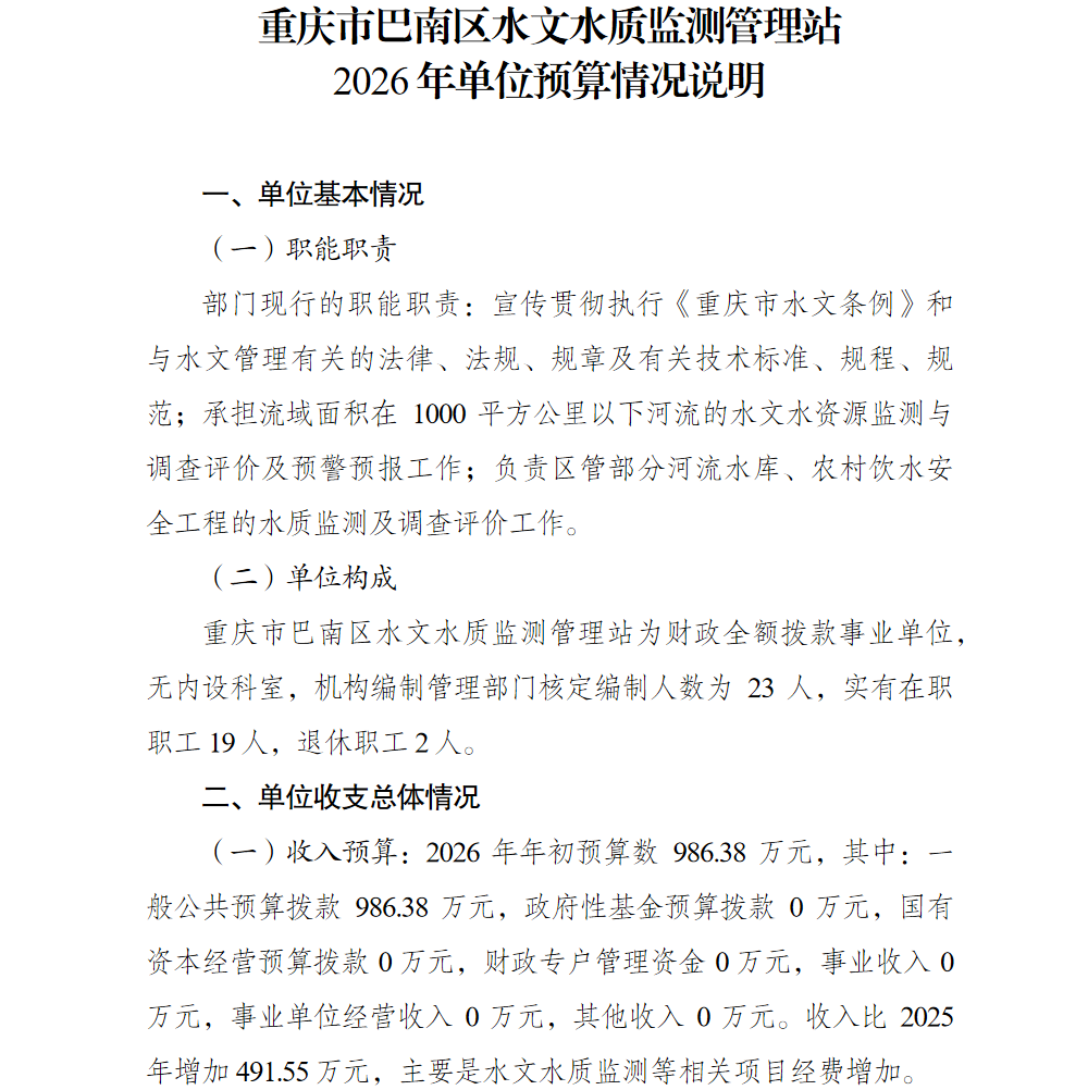 重庆市巴南区水文水质监测管理站2026年单位预算情况说明
