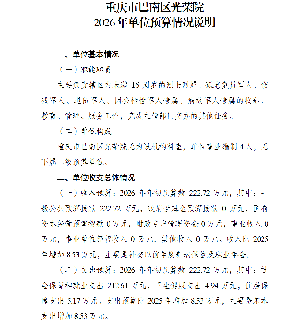 重庆市巴南区光荣院 2026 年单位预算情况说明