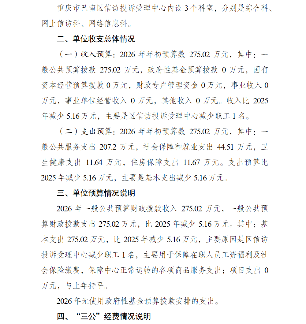 重庆市巴南区信访投诉受理中心2026年单位预算情况说明