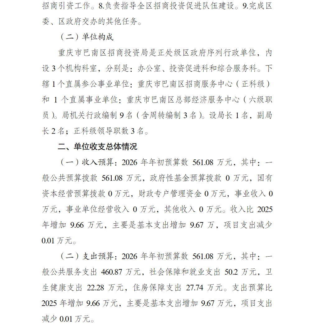 重庆市巴南区招商投资促进局(本级)2026年单位预算情况说明