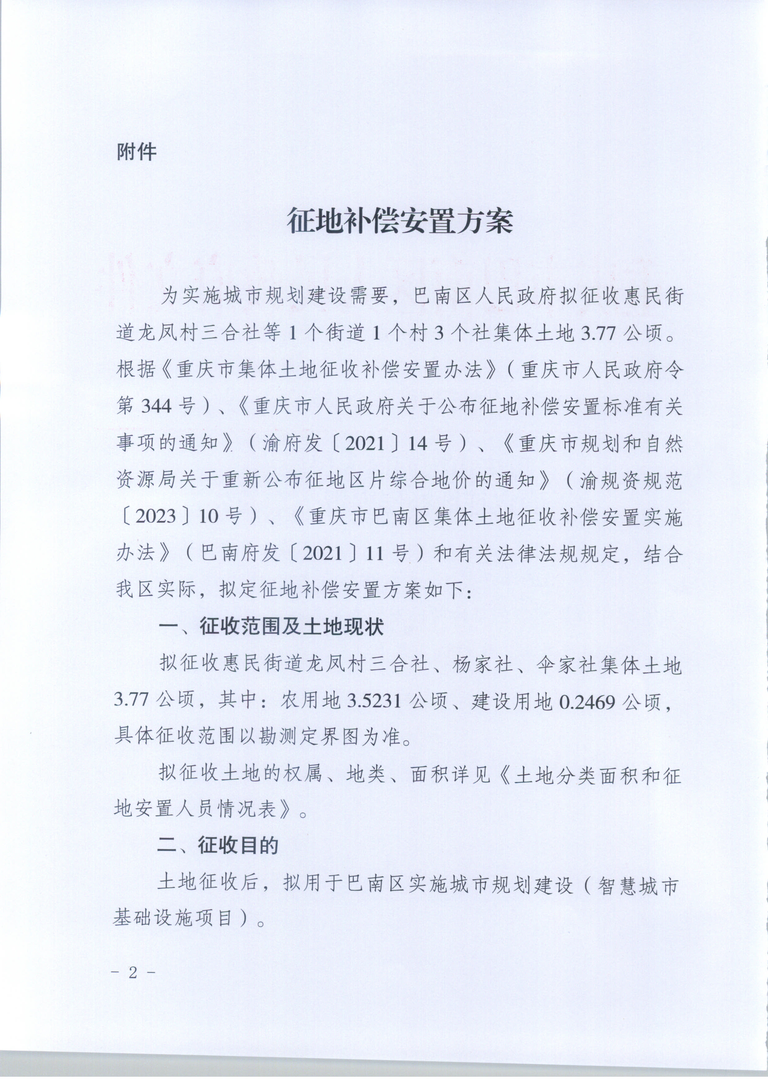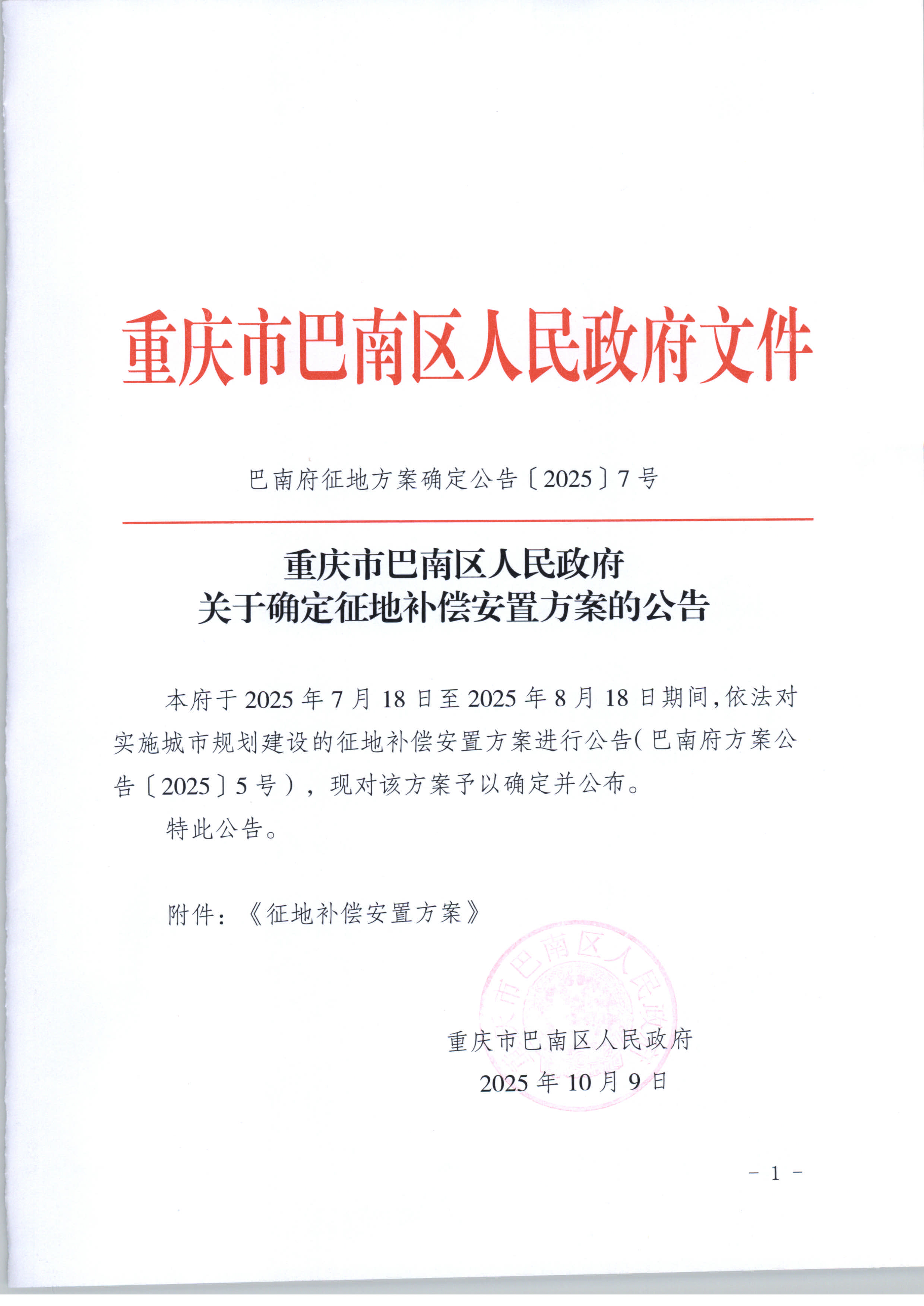 - 巴南府征地方案确定公告〔2025〕7号