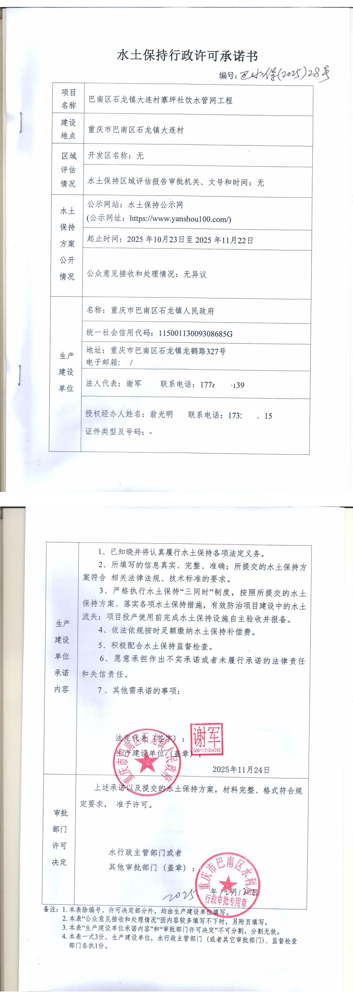 重庆市巴南区水利局关于石龙镇大连村寨坪社饮水管网工程的水土保持行政许可承诺书