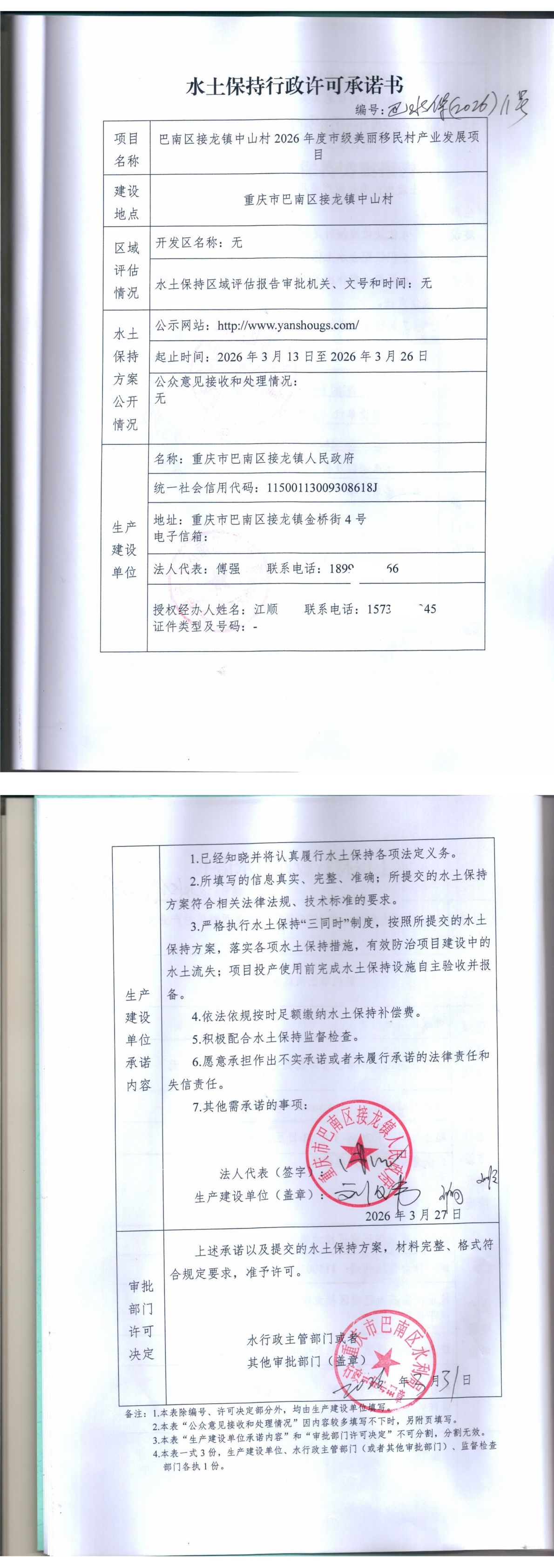 重庆市巴南区水利局关于巴南区接龙镇中山村2026年度市级美丽移民村产业发展项目的水土保持许可承诺书