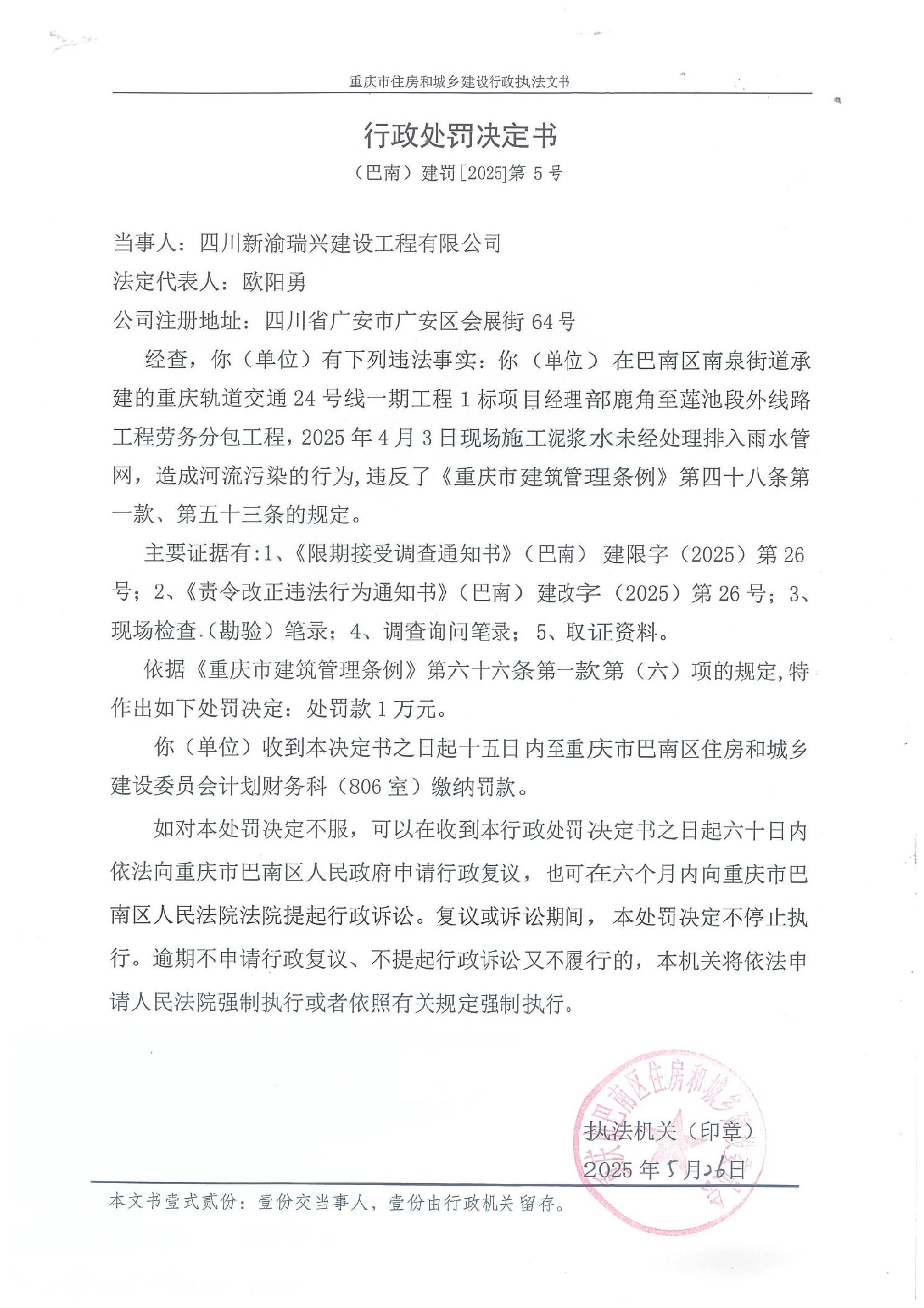 行政处罚决定书(巴南)建罚〔2025〕第5号