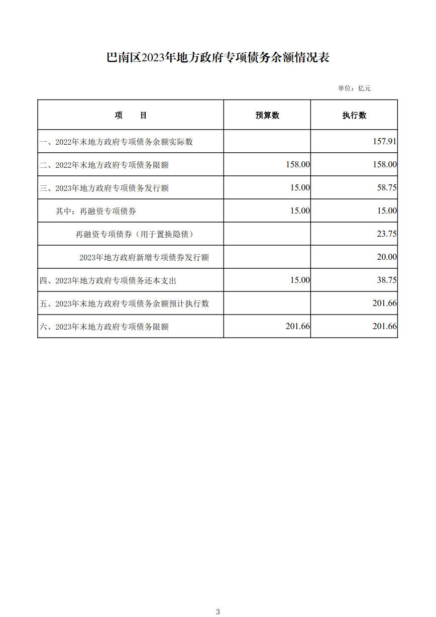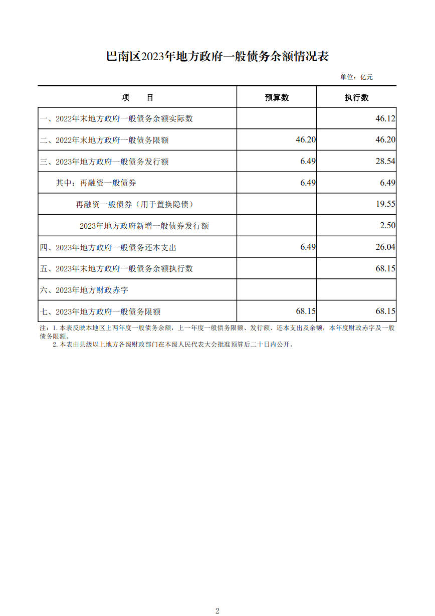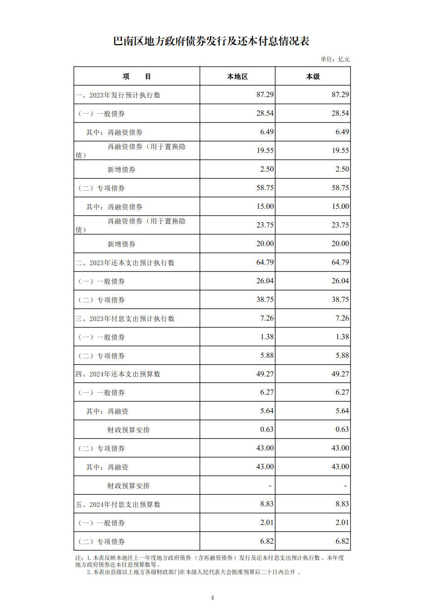 巴南区2023年地方政府债务限额及余额情况表及还本付息情况表