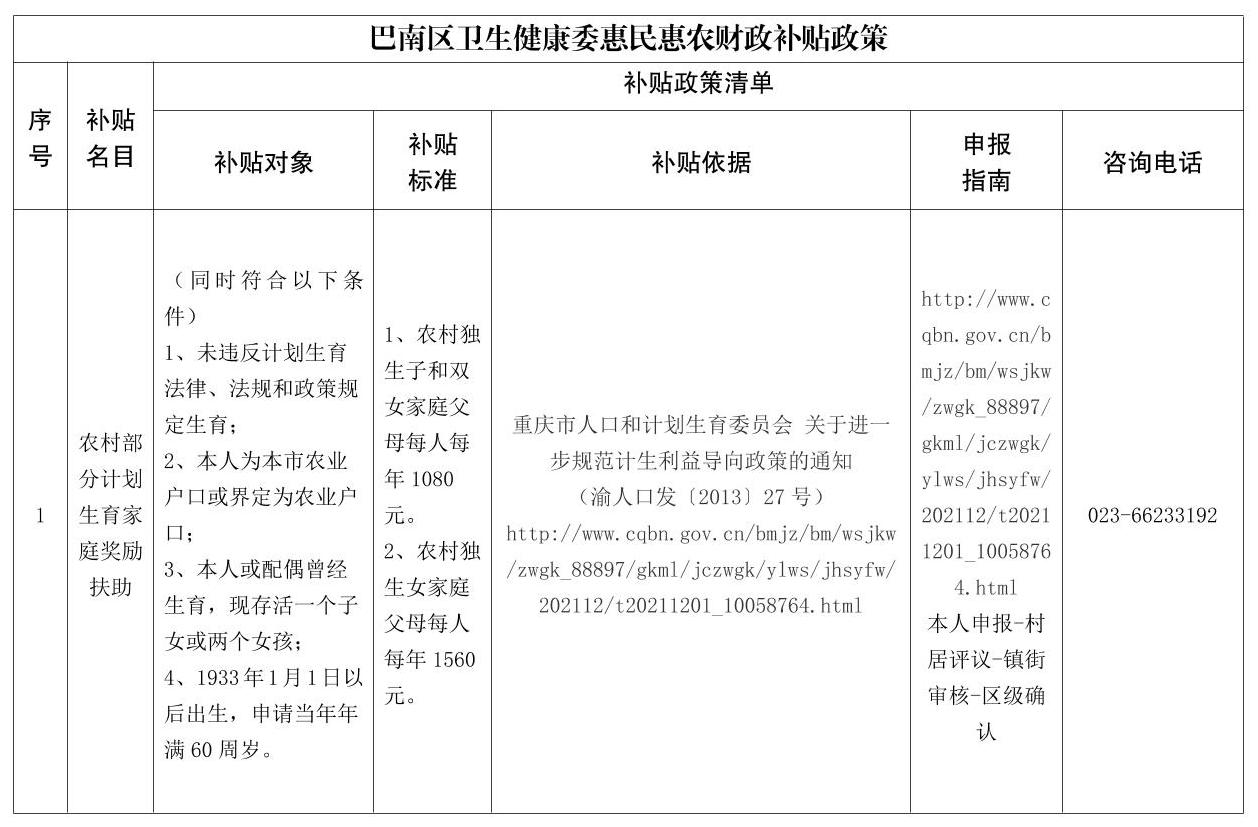 巴南区卫生健康委员会惠民惠农财政补贴政策-补贴政策清单.doc