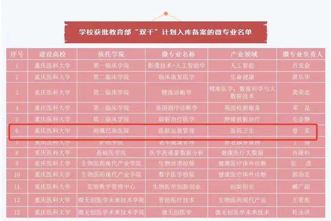 重庆医科大学附属巴南医院(重庆市巴南区人民医院)“医院运营管理”微专业成功入选教育部首批“双千”计划入库项目。