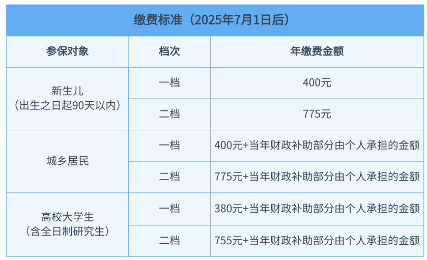 (二)2025年7月1日后缴费,除低保、特困、新生儿等特殊群体外,其他人无法享受财政补助,财政补助资金部分由个人全额承担。具体标准如下: