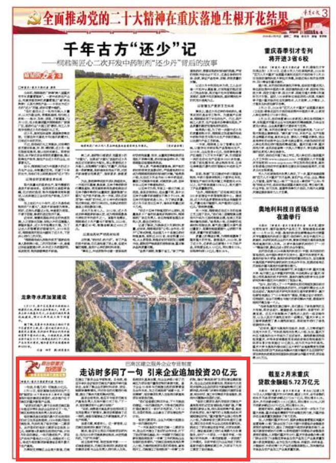 3月19日,重庆日报以“走访时多问了一句引来企业追加投资20亿元”为题,对巴南区招商引资工作成效进行报道。