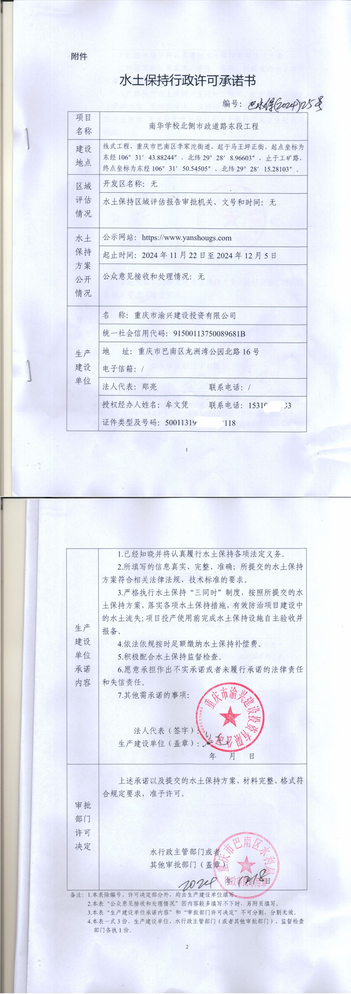重庆市巴南区水利局关于重庆市南华学习北侧市政道路东段工程水土保持许可承诺书